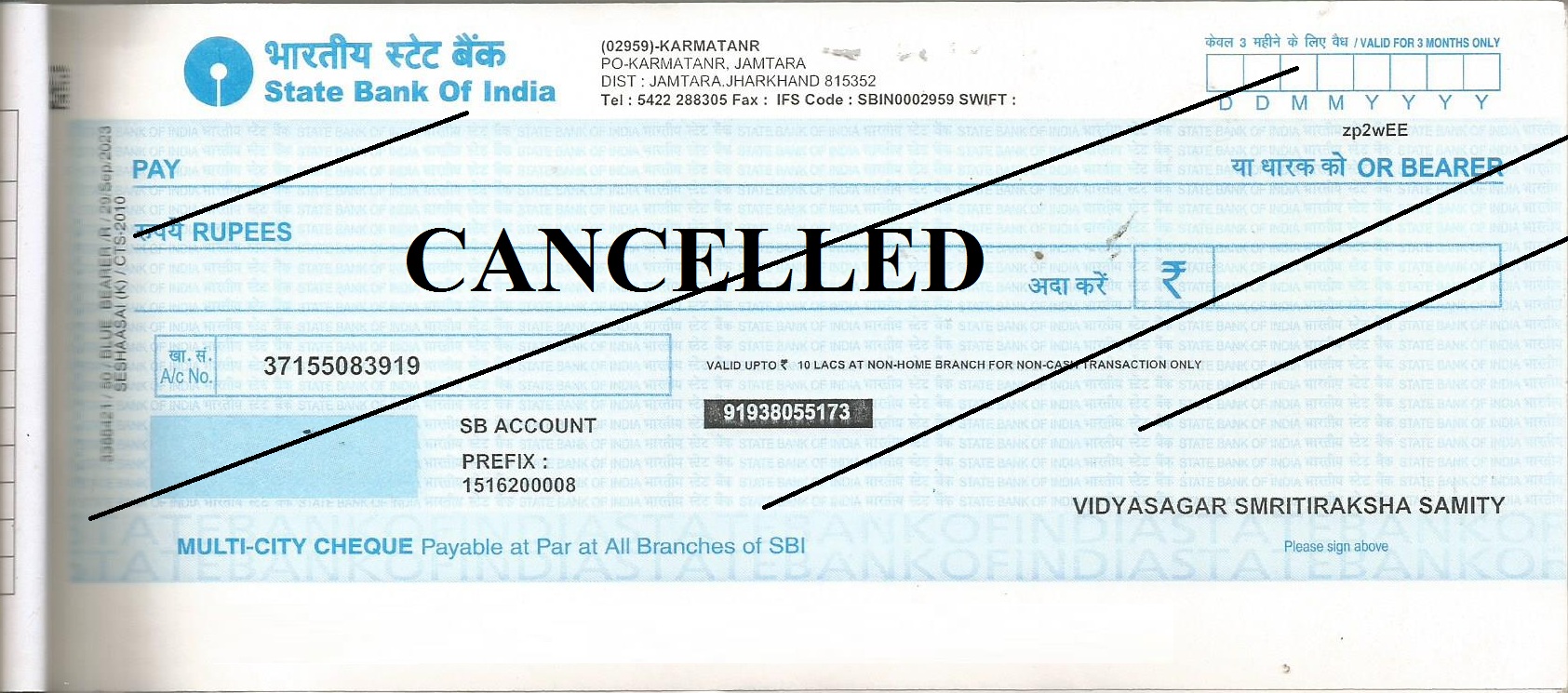| Bank Account Details - A/C Name - VIDYASAGAR SMRITIRAKSHA SAMITY A/C No. - 37155083919 Bank - State Bank of India (SBI) Branch - Jamtara, Jharkhand IFSC Code - SBIN0002959 |